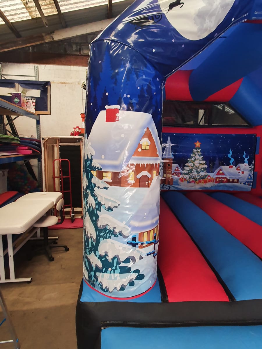 This bouncy castle features a captivating Christmas theme, with beautifully designed front pillars and archway adorned with festive decorations. The backwall showcases a cheerful winter scene, complete with snowflakes, Santa Claus, reindeer, and other iconic Christmas elements. The vibrant colours and attention to detail make this bouncy castle a standout attraction at any event.