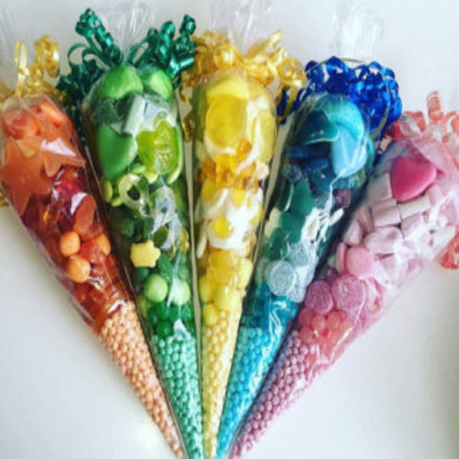 This product comes with a variety of sweets, wrapped in a pretty stylish cone. We have a variety of sweets from Haribo's, Marshmallows, Swizzler Matlow, Rainbow Drops and much more!