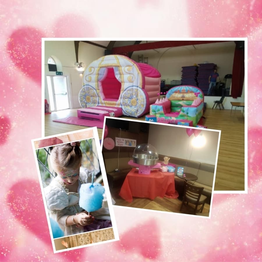 Our princess carriage castle is 13.2ft wide x 16ft long x 11ft high, the air juggler is 8ft long x 5ft wide and the candyfloss machine comes with an unlimited supply and a member of staff.