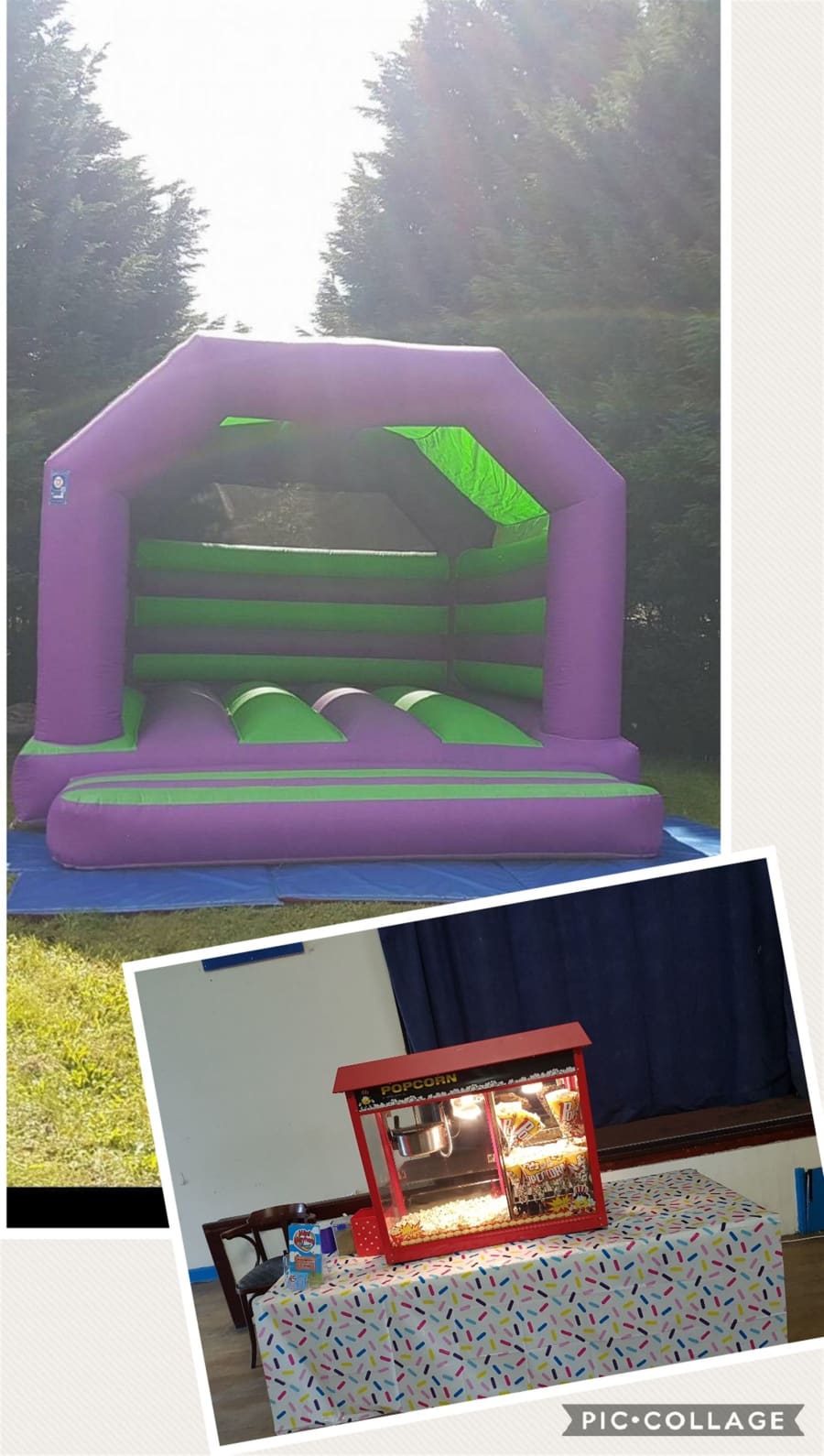 This bouncy castle and popcorn machine bring hours of fun for everyone.