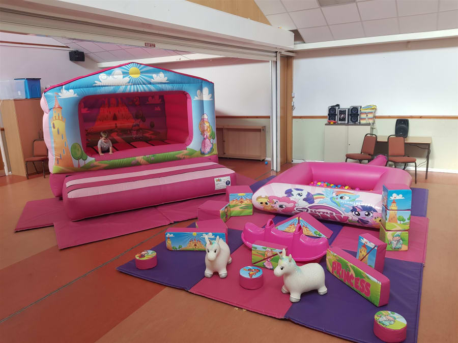 If your little one likes My Little Pony, being a Princess or her favourite colour is pink then this is the package for her as it includes my little pony on the ballpit front plus an abundance of pink colour over the whole package and a Princess theme on the front and back wall of the bouncy castle.
