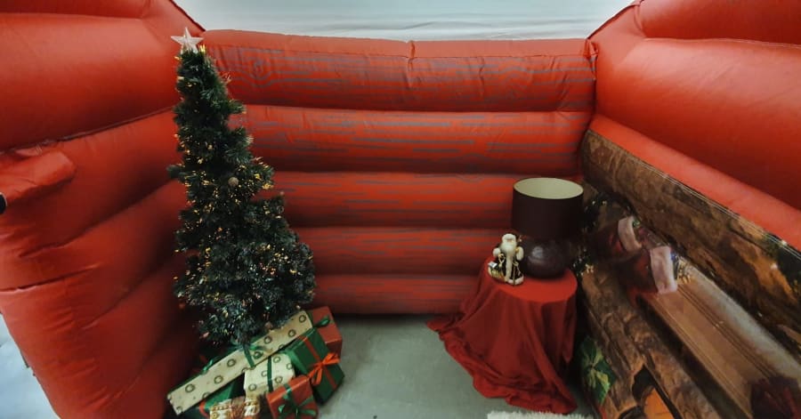 The inflatable walls of this Santa's Grotto have a traditional wooden-themed design with a snow effect, creating an authentic appearance that kids will love.